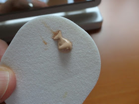 直接把海綿堵住瓶口搖一搖,粉底液就像這樣完全吸入了海綿。這款粉底顏色偏深,我喜歡自然色,第二白102號剛剛好... 這個顏色我很喜歡。